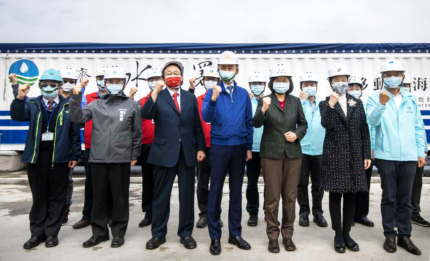 因應緊急抗旱需求,經濟部水利署在竹市建置緊急海淡設施,林智堅市長今(13)日陪同蔡英文總統前往視察,慰勞年節期間堅守岡位的同仁。「我們已經創造歷史」,總統蔡英文感謝同仁66天就完成第一階段、日產3千噸用水,並犧牲春節假期,持續推動第二階段工程,預計2月底可提供新竹地區每日1萬3千噸用水。