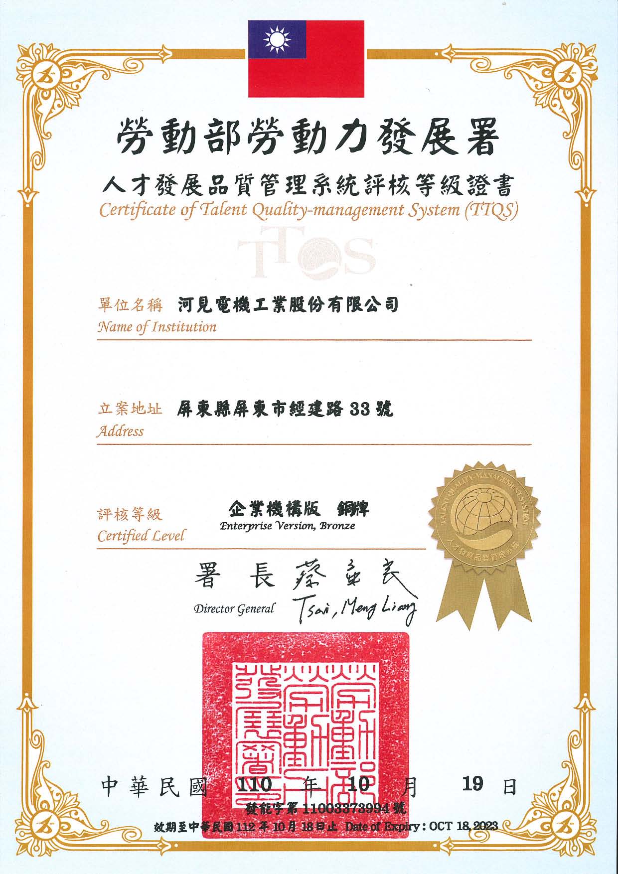 據此,河見教育訓練系統內涵的計畫、設計、執行、查核、成果評估等階段,依據人才發展品質管理系統(Talent Quality-management System, TTQS)進行,以確保訓練流程的可靠性與正確性,並榮獲勞動部勞動力發展署TTQS人才發展品質管理系統110年度評核企業機構版銅牌肯定。